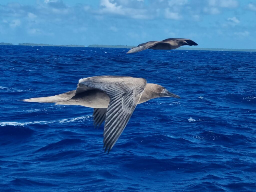 De notre côté, nous sommes donc partis en catamaran vers Tetiaroa. Environ 4h30 de navigation sur une mer calme, un beau soleil, et les oiseaux qui nos tournent autour. Notamment des fous, ces grands oiseaux qui vont pêcher en haute mer et que l’on retrouve parfois à 100 km des îles. L’un d’eux a d’ailleurs fini le trajet avec nos, perché sur le bateau.