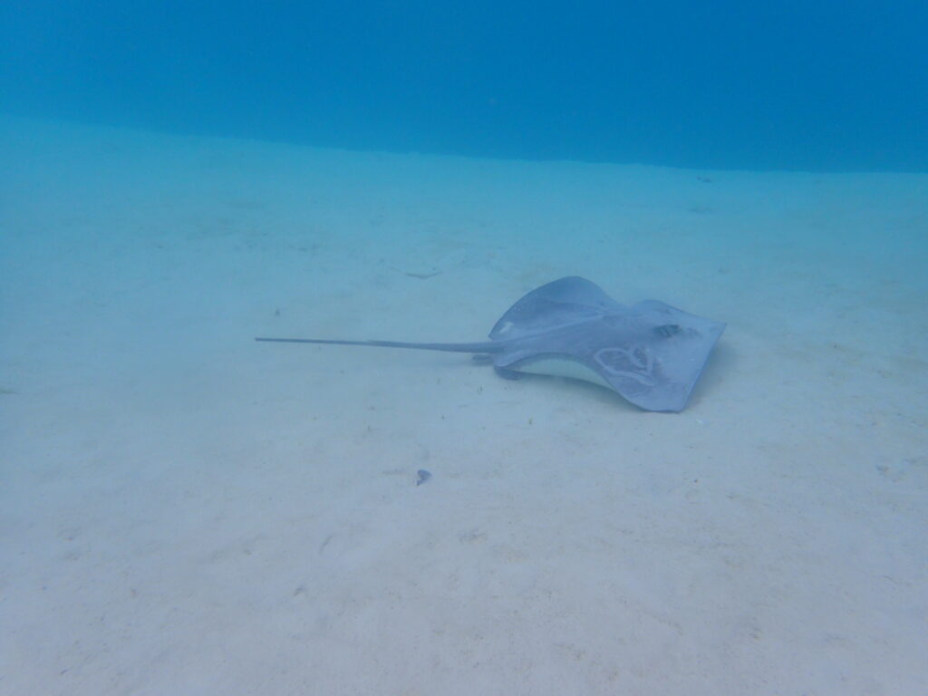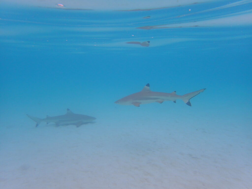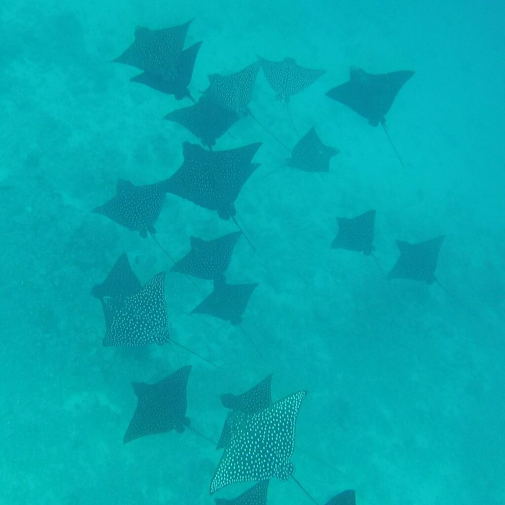 Sur le chemin du retour nous nous arrêtons dans une passe (lieu de rupture d’un récif, qui permet d’accéder au lagon) où des surfeurs surfent la vague. On se mettra tous à l’eau(Maël inclus) pour voir un banc de raies léopard (des raies tachetées) évoluant à 20m de profondeur.