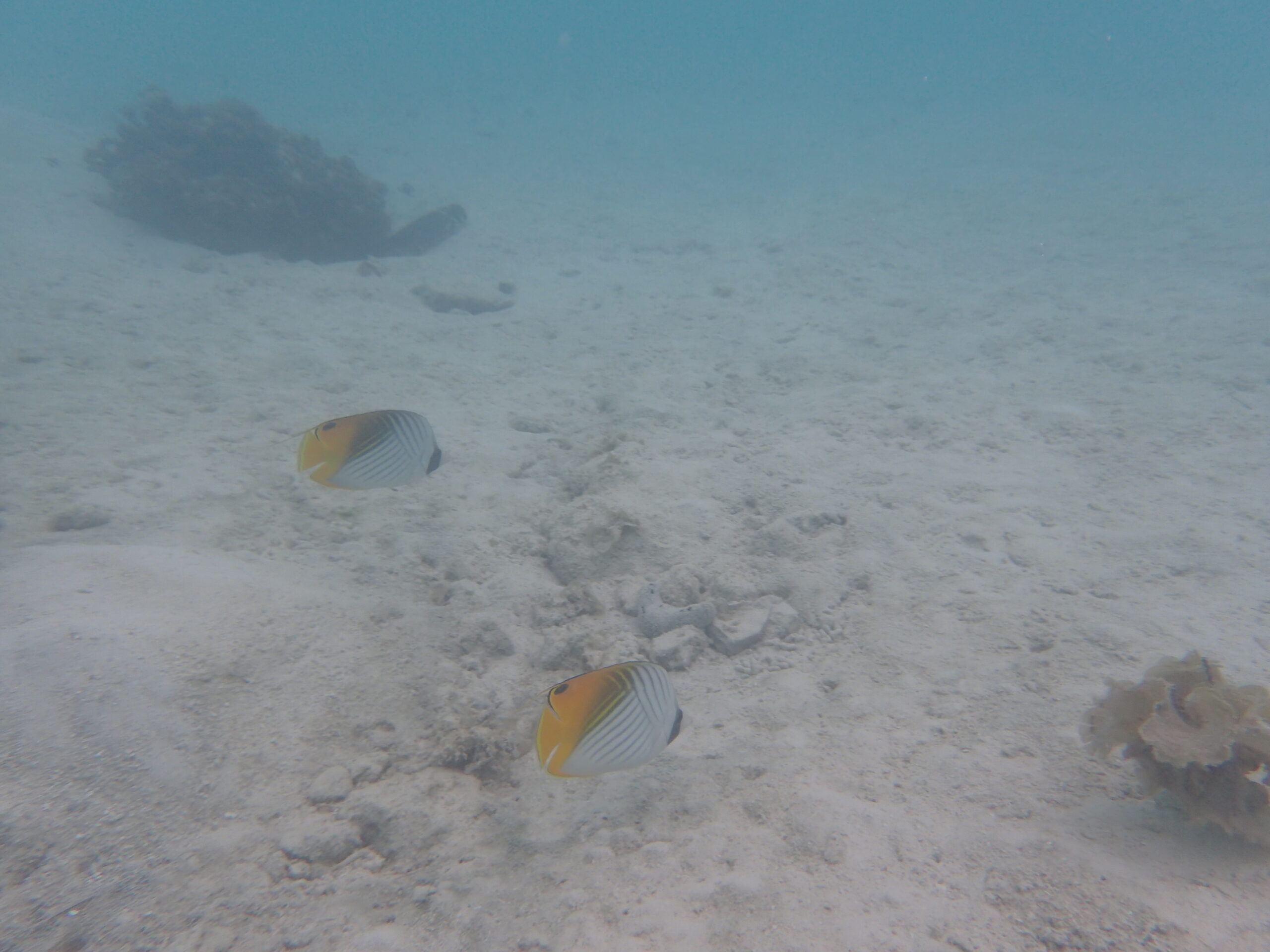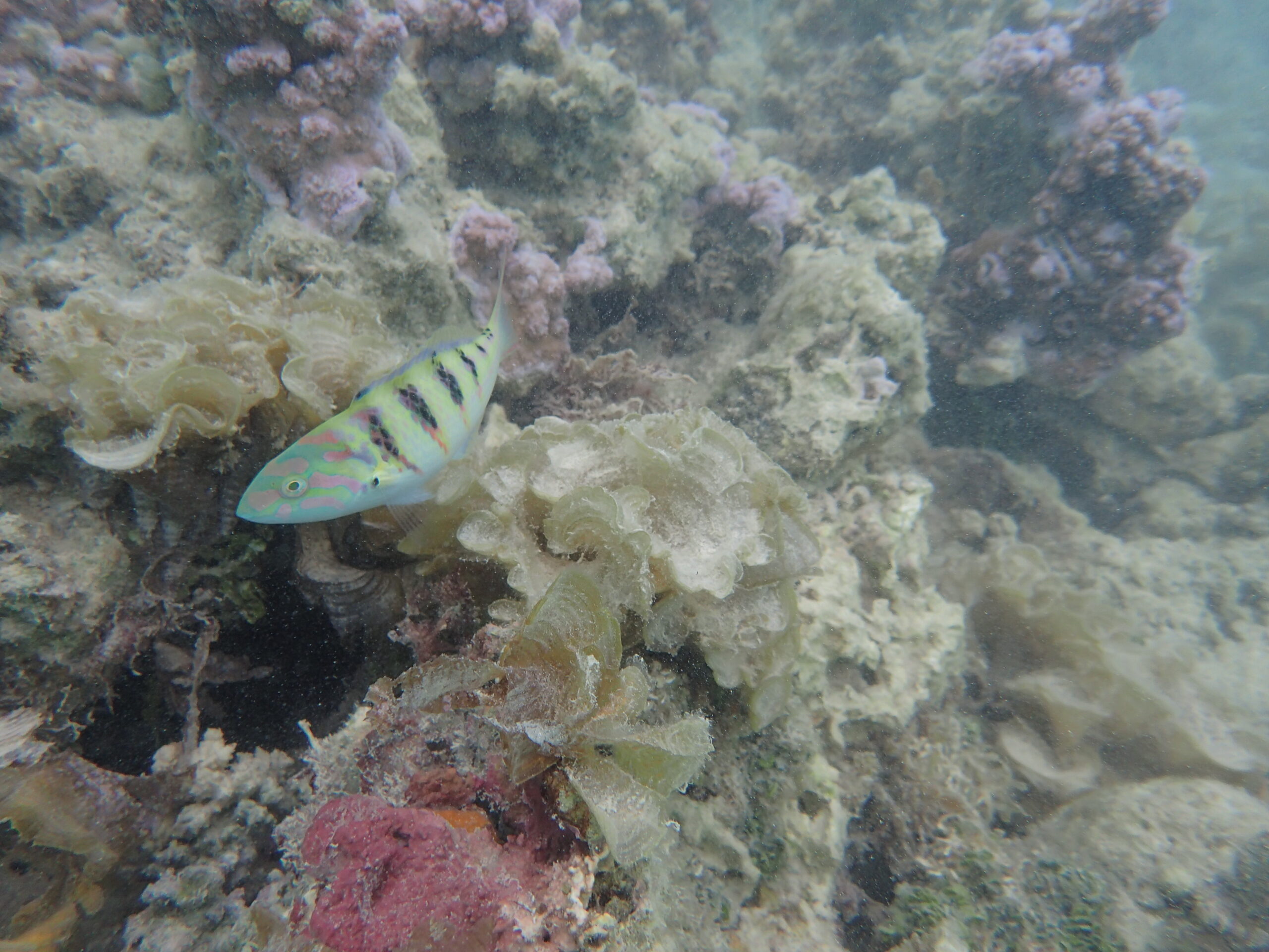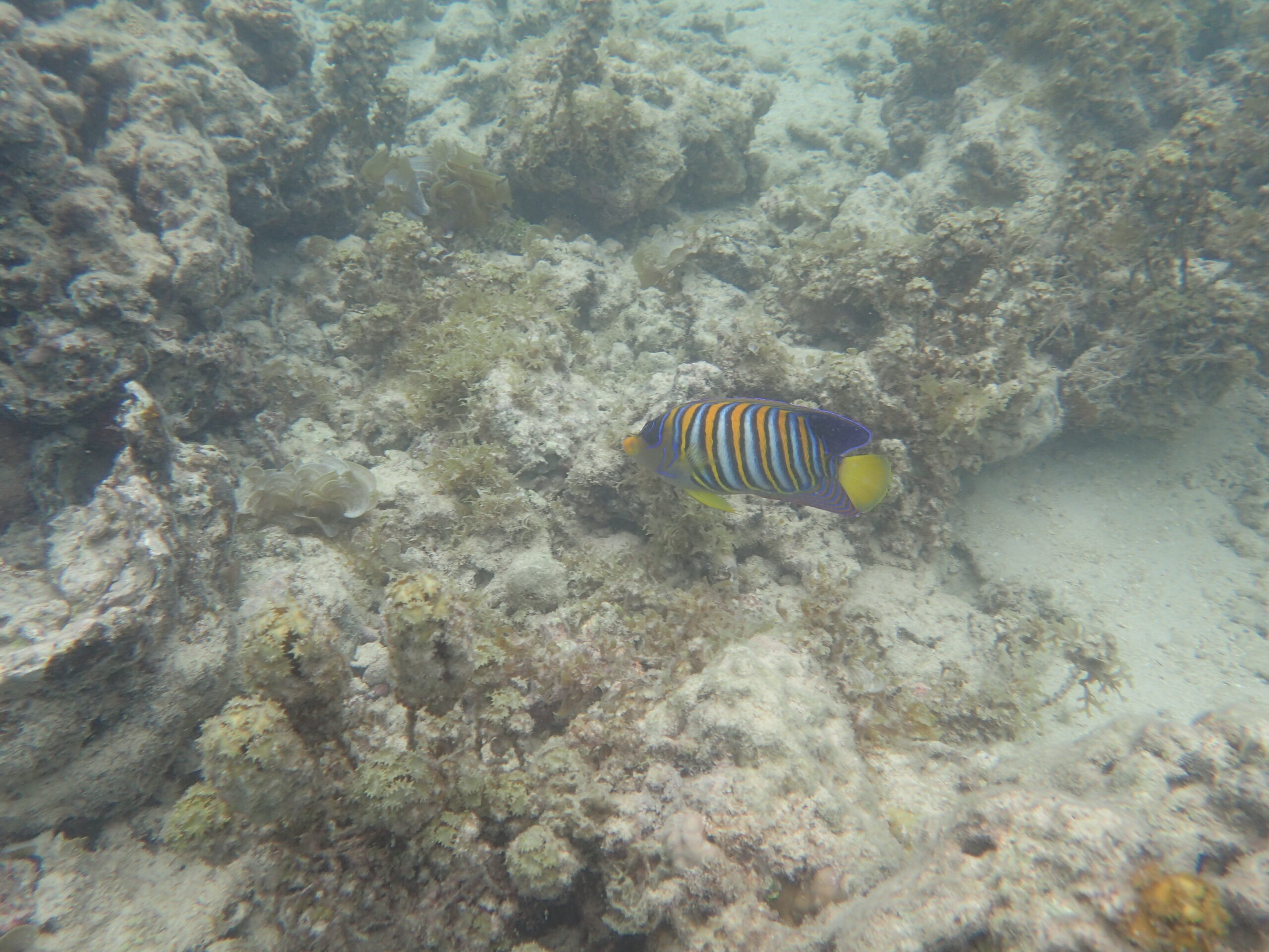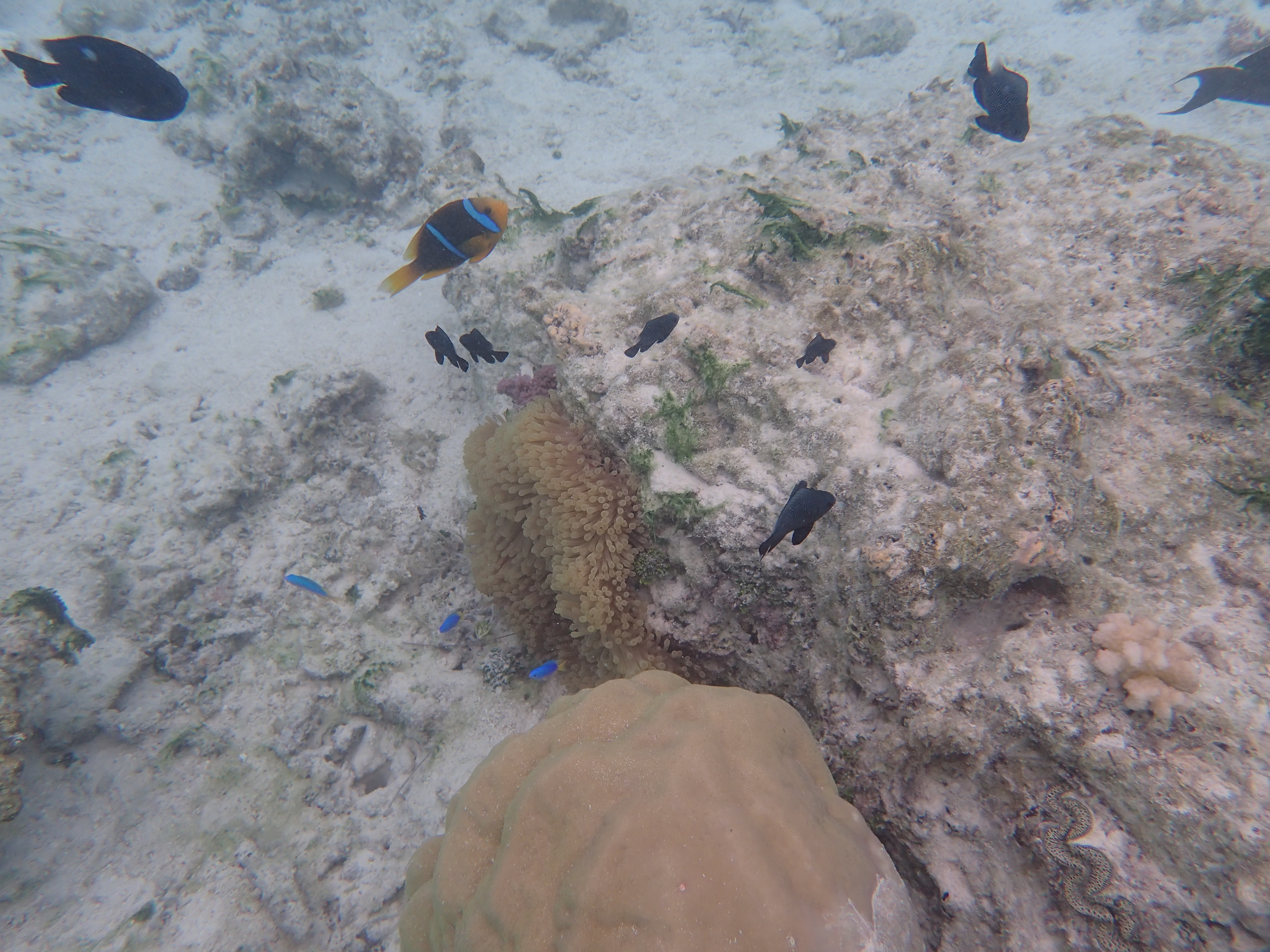 Les poissons et autres animaux vus en snorkeling : demoiselles (plein de couleurs différentes), Balistes (Picasso, Noir, Strié : des poissons qui peuvent attaquer quand ils sont gros), Poisson cocher commun, Poisson clown, Perroquet, Carangue bleue, Demoiselles à raies blanches, Acanthaster (étoile de mer à épines, tueuse de coral, elle-même mangée par un escargot géant), concombres de mer, oursin diadème, coussin de requin, rougets à ligne blanche, papillon à 2 selles, sole tropicale, raie, requin pointe-noire, requin pointe-blanche.