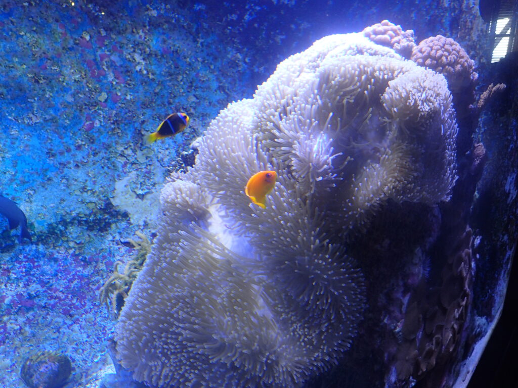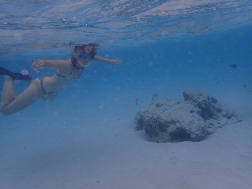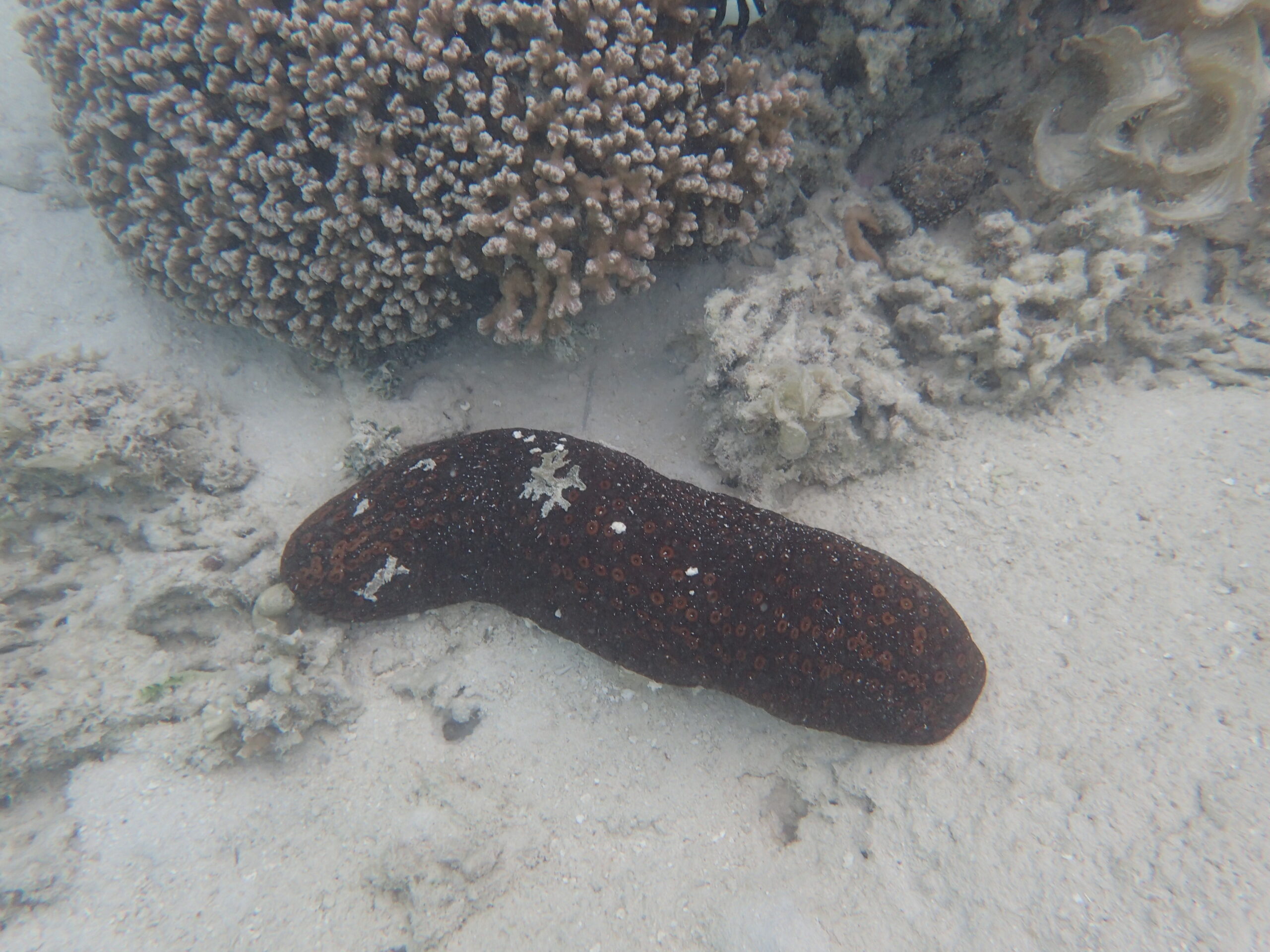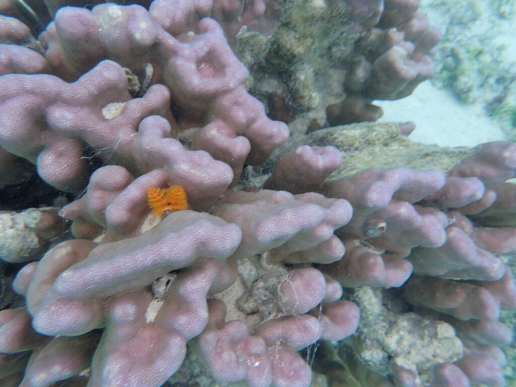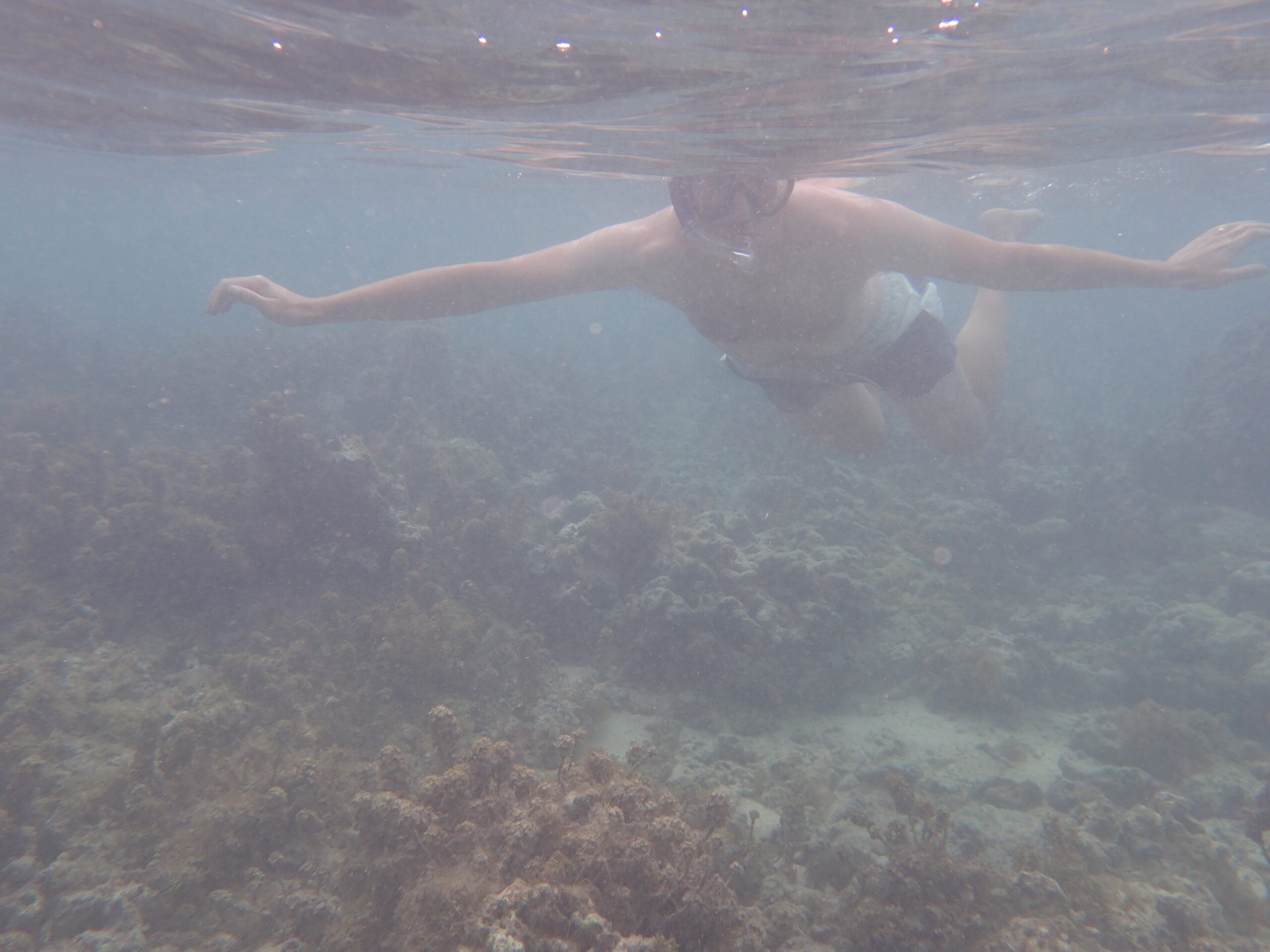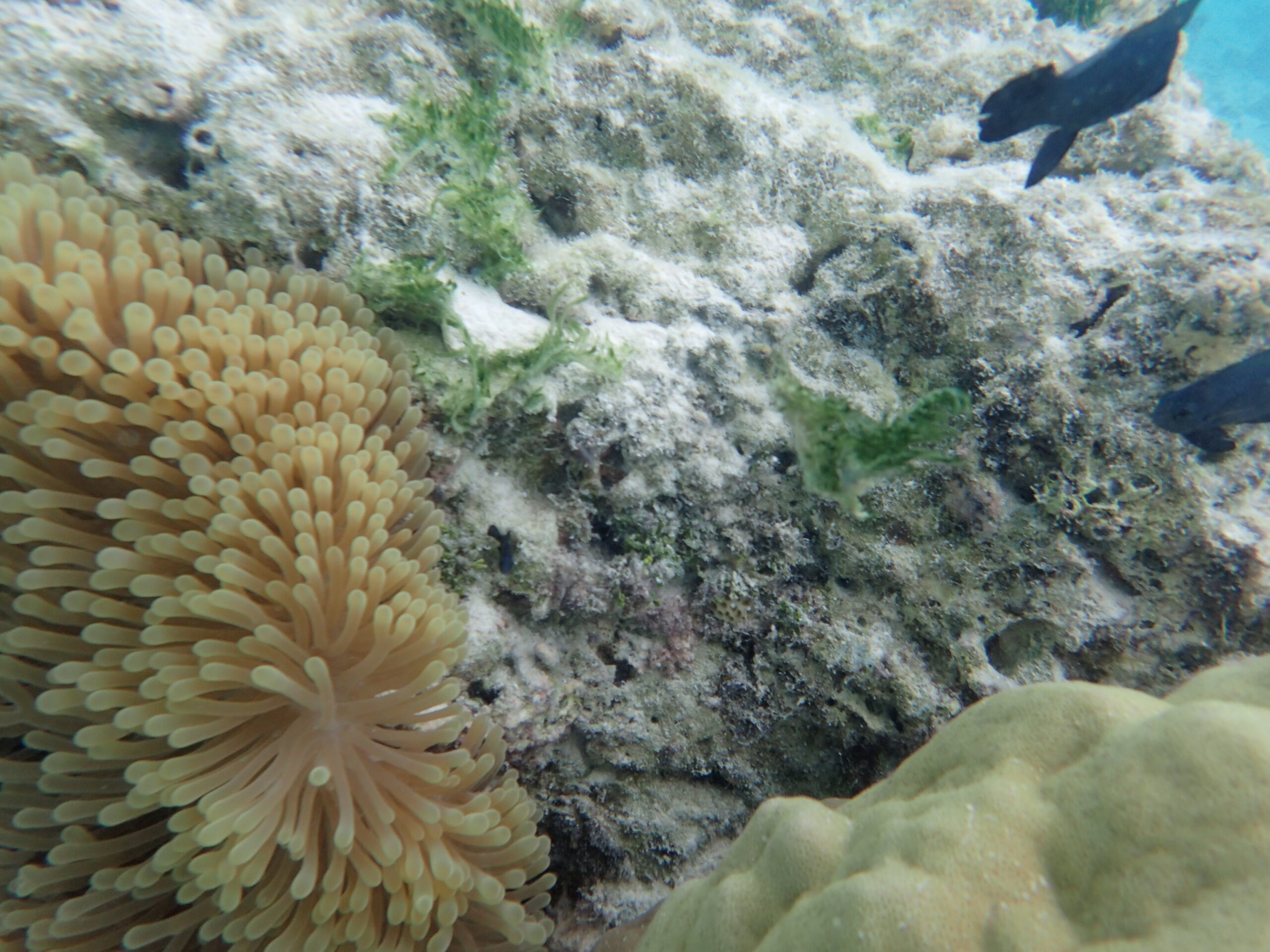 Les poissons et autres animaux vus en snorkeling : demoiselles (plein de couleurs différentes), Balistes (Picasso, Noir, Strié : des poissons qui peuvent attaquer quand ils sont gros), Poisson cocher commun, Poisson clown, Perroquet, Carangue bleue, Demoiselles à raies blanches, Acanthaster (étoile de mer à épines, tueuse de coral, elle-même mangée par un escargot géant), concombres de mer, oursin diadème, coussin de requin, rougets à ligne blanche, papillon à 2 selles, sole tropicale, raie, requin pointe-noire, requin pointe-blanche.