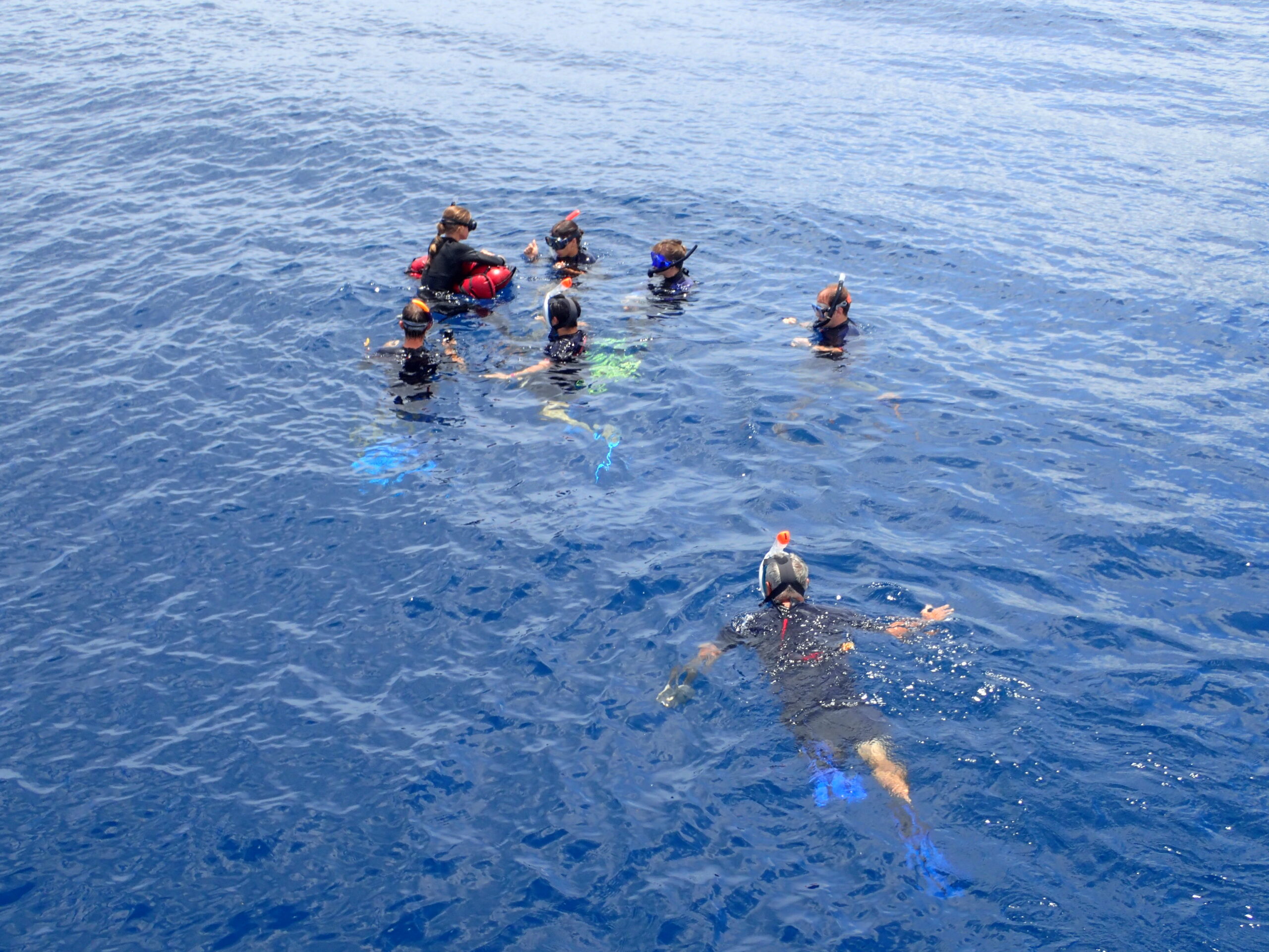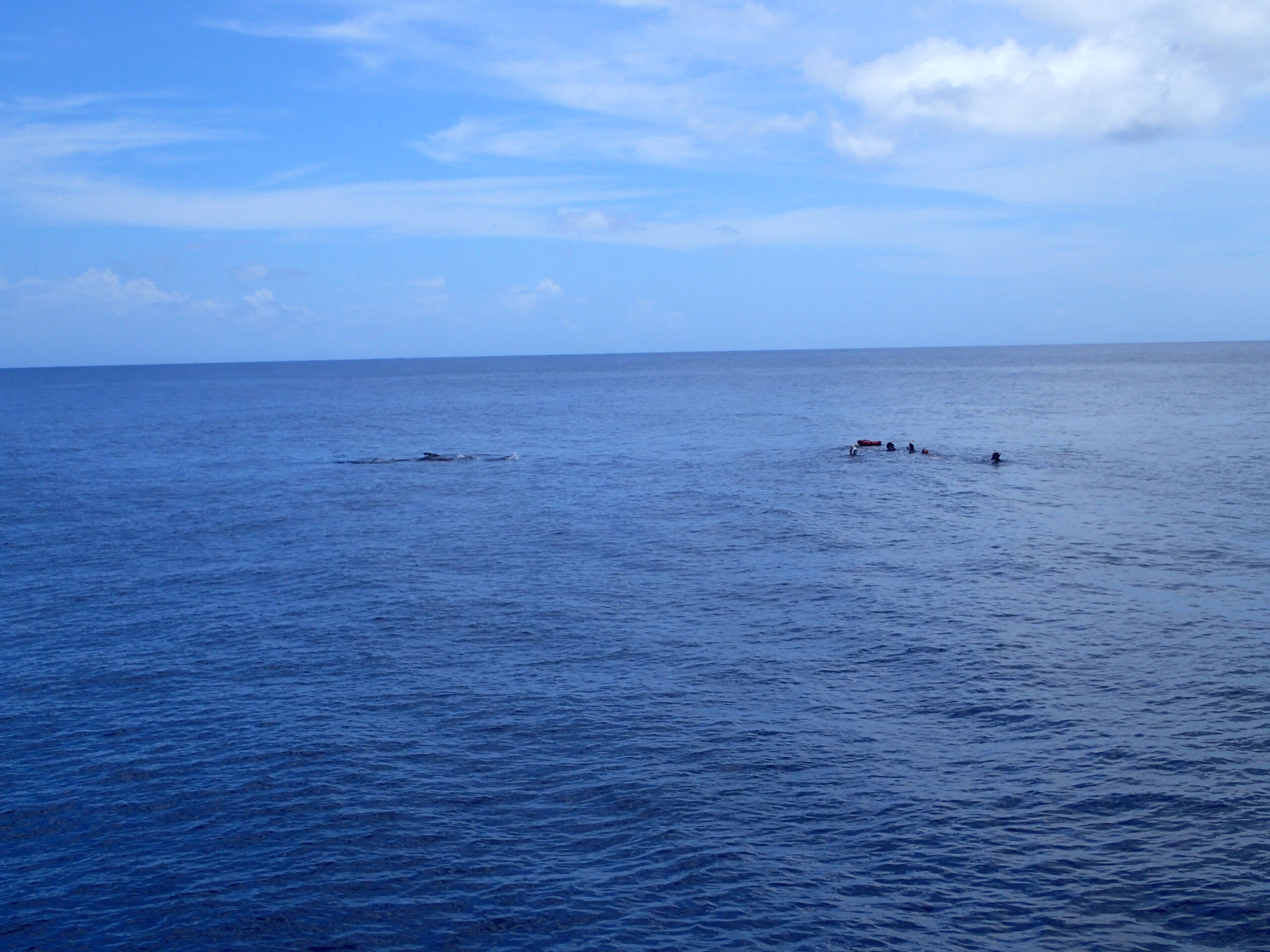 Nous sommes partis le matin de la marina de Taravao, vers l’océan. Sur le trajet les deux personnes de l’entreprise Natura tahiti nous montrent ce qu’on peut voir dans la zone en mammifères : baleine à bosse et son petit, mais aussi juvéniles de requin marteau, et très rarement, cachalot. L’objectif est la baleine, et on apprend comment la repérer au loin pour s’en approcher et espérer faire une mise à l’eau.