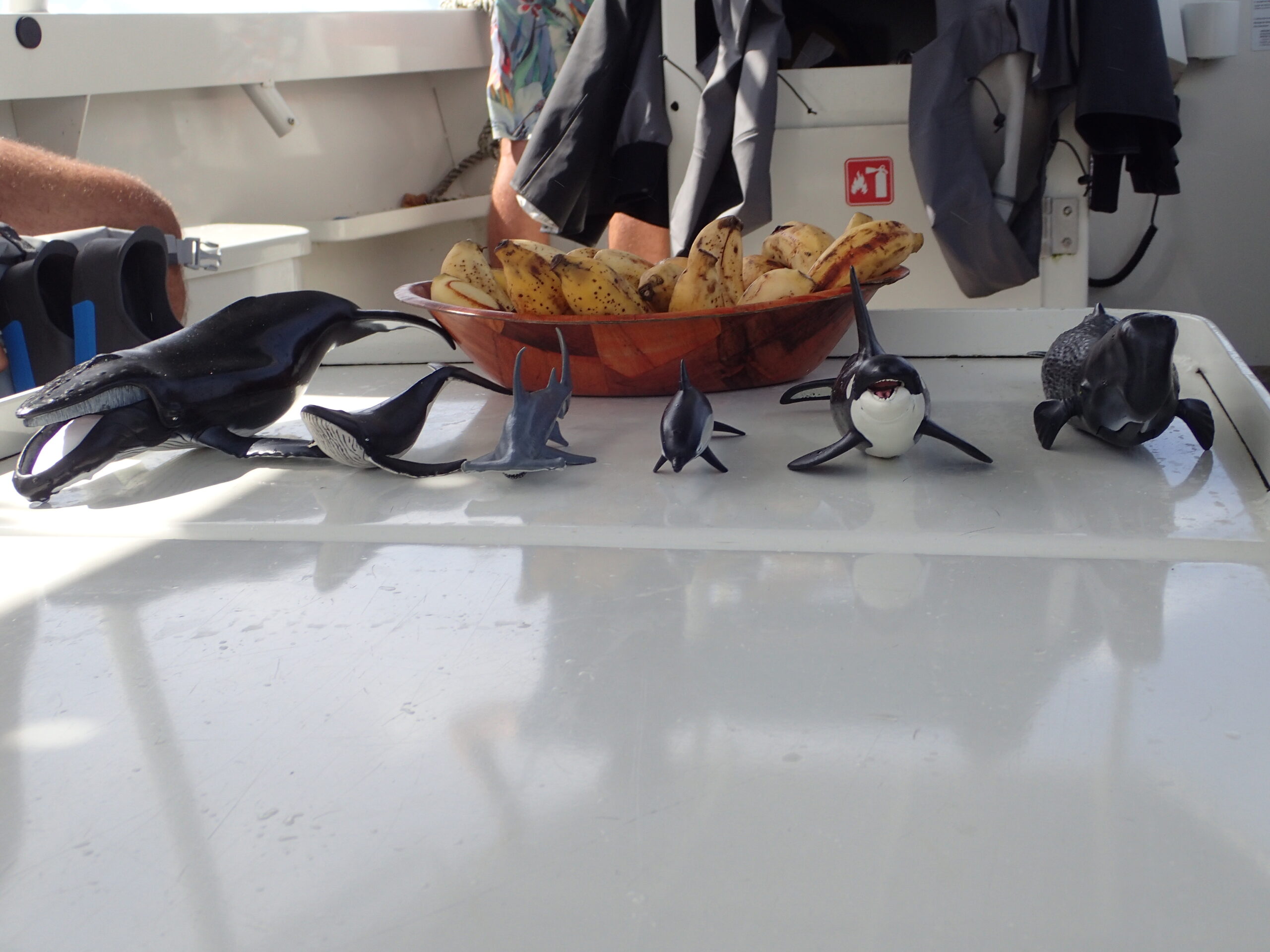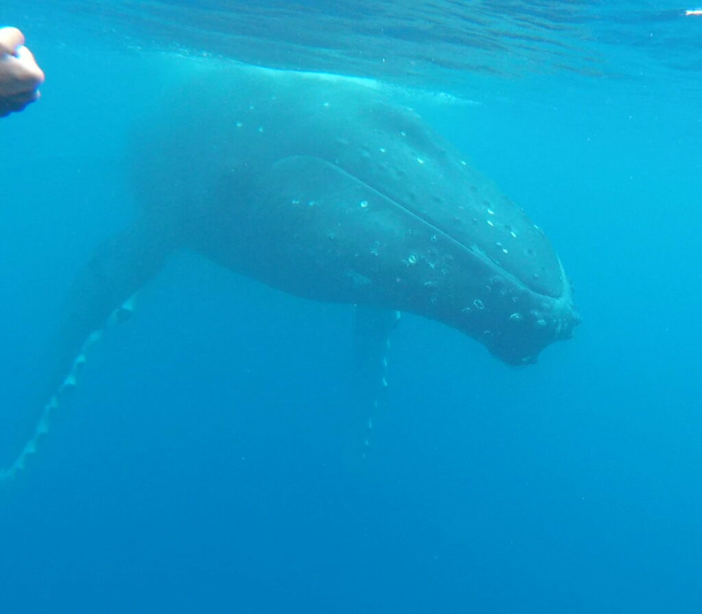 Après 30 min de navigation, dans une mer qui commence à s’agiter, on en repère. 3 : une maman, son baleineau et « escorteur », un mâle qui espère se reproduire (avec une femelle qui allaite…ce qui est impossible). Guillaume et Chloé se mettent à l’eau avec 4 autres personnes et l’encadrante. Palmes, masque, tuba et combinaison légère sont l’équipement, pour se plonger dans le « grand bleu » (500m de profondeur). On aura la chance de s’approcher, de voir le baleineau jouer, et la mère et le mâle remonter à la surface. On entend même un chant (de séduction du mâle vers la mère) sous l’eau. Les vidéos GoPro nous permettent aussi d’entendre la communication mère-enfant, dans des fréquences graves et à ondes courtes qu’on ne percevait pas à l’oreille nue. Le son grave porte moins, les baleineaux doivent donc rester proches de leur mère pour les entendre.