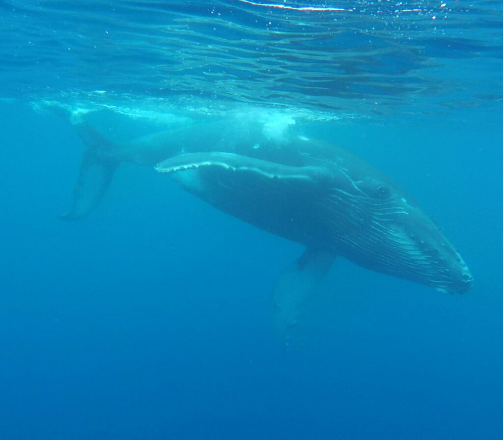 Les baleines à bosse de l’hémisphère sud vivent en antarctique et viennent mettre bas en Polynésie ou à La Réunion de Juillet à Novembre, dans les eaux chaudes, avant de repartir avec les baleineaux de 3-4 mois. La gestation dure 11 mois, les baleineaux passent 1 an auprès de la mer. Ils grossissent de 40 kg/jour, en buvant près de 300L de lait/jour, et atteindront 14m et 20 tonnes à l’âge adulte. On les repère car les baleines viennent respirer toutes les 15-20 min à la surface et produisent des souffles d’air/eau en expulsant l’air vicié. Les baleineaux tiennent moins longtemps en apnée : 30 sec à la naissance et 8 min à la fin du séjour en Polynésie, quand ils sont prêts à repartir vers l’Antarctique.