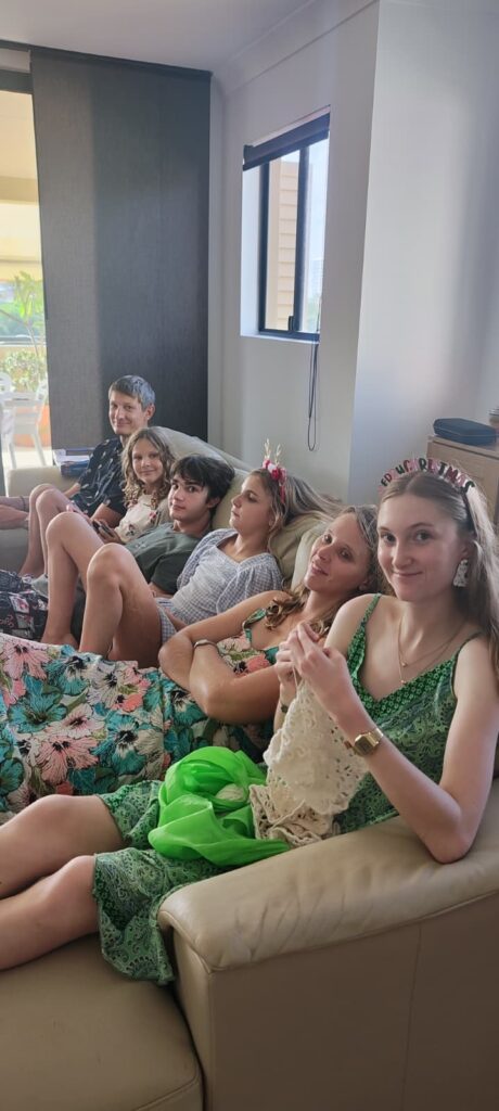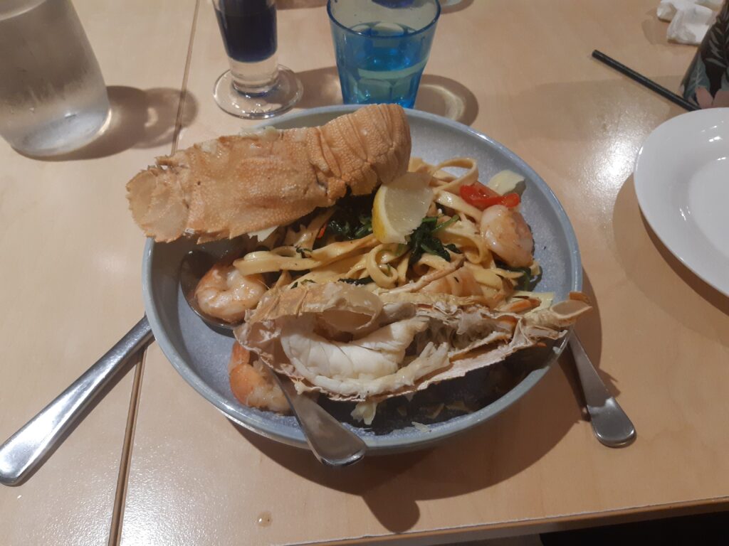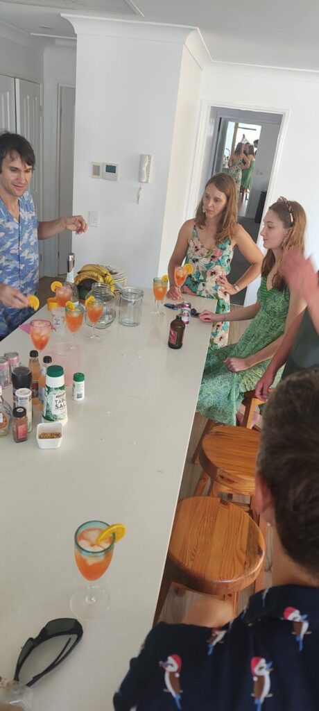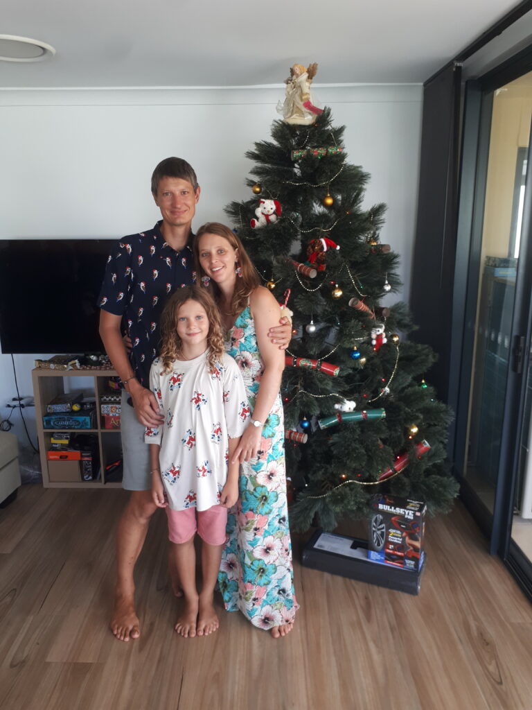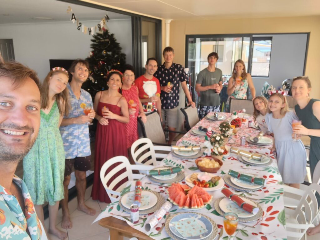 Les célébrations de Noël commencent pour nous par une messe de Noël le 24 au soir, suivi d’un diner dans un « surf club », les clubs des équipes de « surf life savers », les sauveteurs secouristes australiens, qui hébergent en général un bar, un restaurant, un casino. La tradition est aux fruits de mer pour Noël, et les restaurants n’offrent pas vraiment de cartes de dessert. C’est dépaysant ! Puis le 25 décembre on se réunit chez Pierre-Louis et Jayahna, avec les parents et le frère de Jayahana pour un « late lunch » de Noël après une matinée à la plage. Le déjeuner débutera à 15h30 pour se terminer à 20h (interrompu par une partie de Just Dance et un nouveau passage à la plage). Après l’apéro et les cadeaux, on craque des « crackers » (de gros pétards à faire exploser à 2 et qui contiennent une couronne en papier et des blagues carembars). Au menu du déjeuner : salade de crevettes/avocat, salade de pommes de terre, Wellington de saumon et végé, gratin de courge. Pas de fromage (sans surprise), et en desset une tarte au caramel/crème fouettée, de la pastèque, et du rocky road (un mélange de chocolat, marshmallow, loukoum et noix de macadamia qui se déguste en petites bouchées).