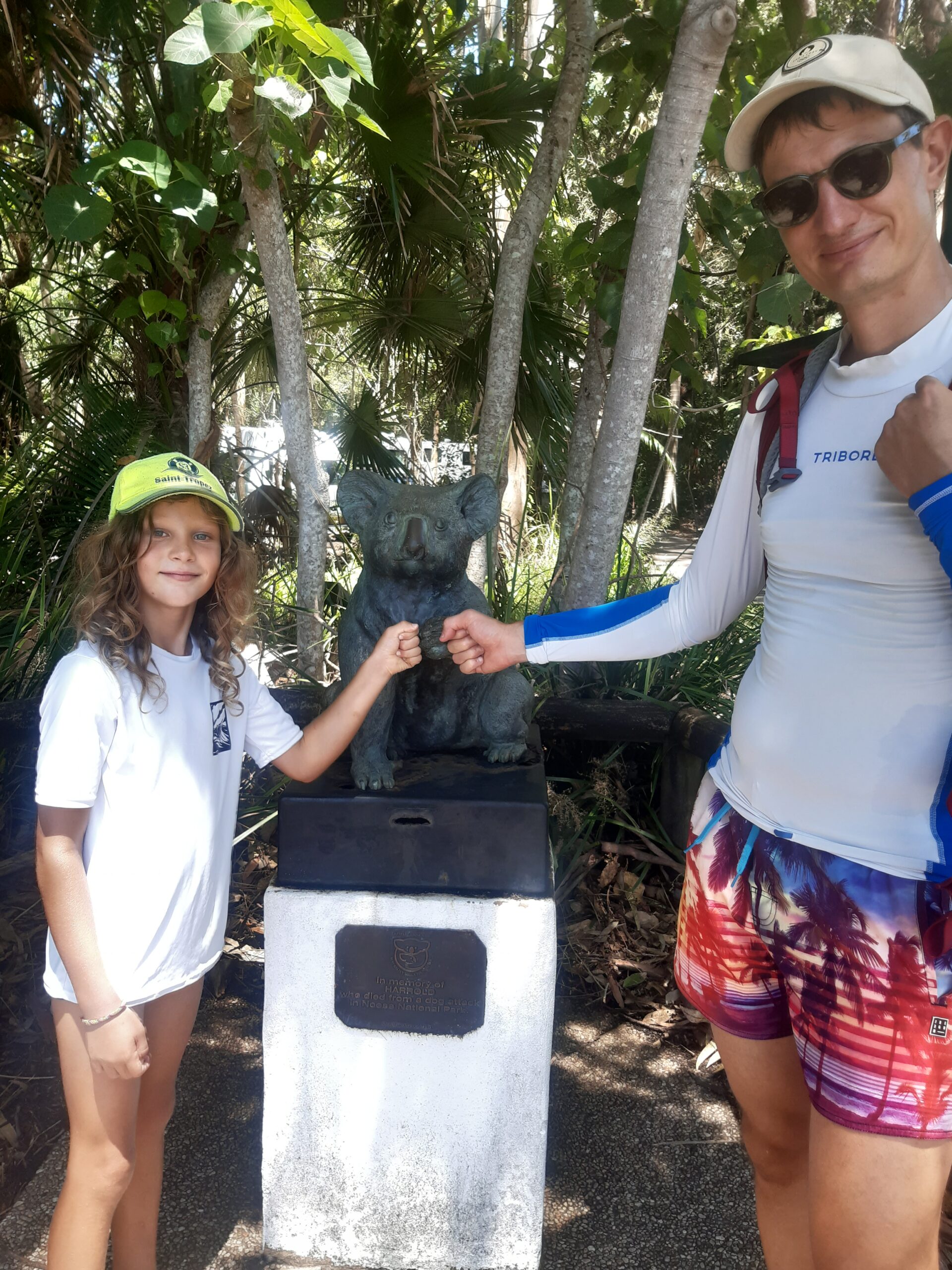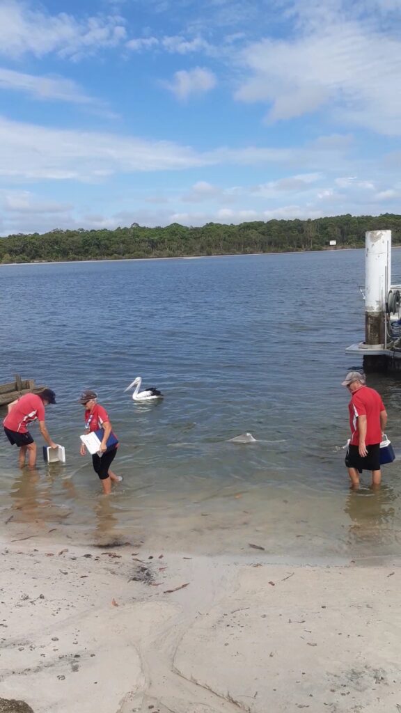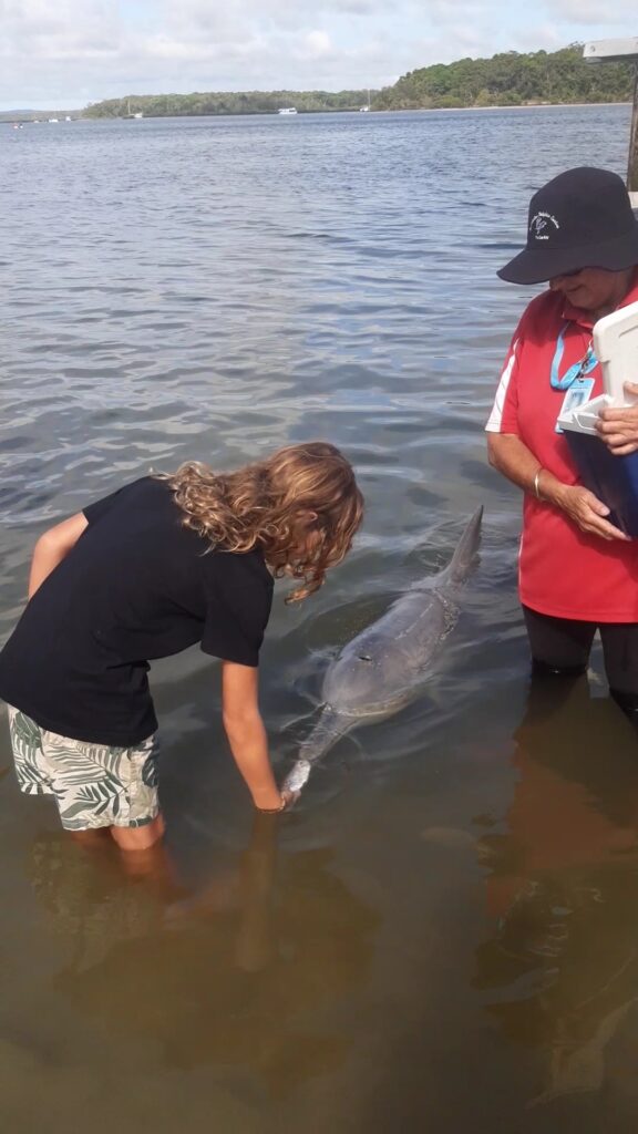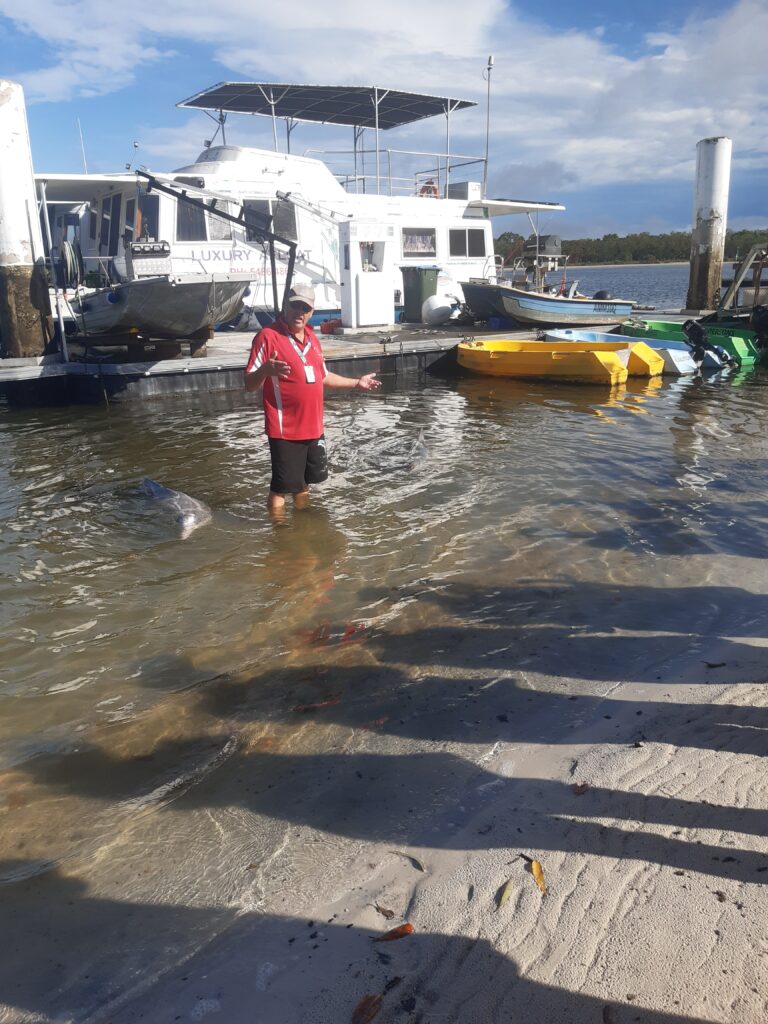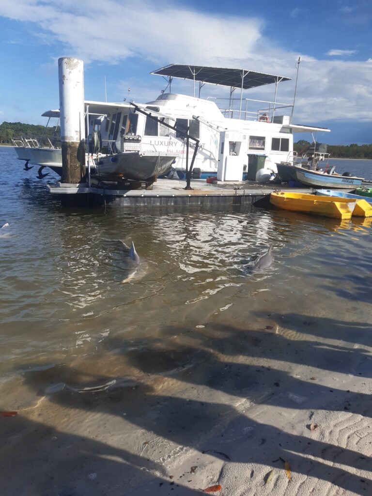Après cette journée randonnée, on continue vers le nord après un arrêt dans un camping où l’on verra nos premiers kangourous en liberté ! Direction Tin Can Bay, petite ville abritant un spot de nourrissage de dauphins. On s’arrête pour la nuit (avec de l’electricité, enfin !) et au petit matin, nous voilà partis à pieds pour le centre. C’est une attraction animée par des bénévoles, qui nous expliquent qu’un groupe de dauphins vient régulièrement depuis une trentaine d’année, pas toujours les mêmes chaque jour. Ils les nourrissent de 2 à 3 kg de poissons par jour, tous les jours, ce qui représentent entre 10 et 20% des besoins des animaux : pour le reste, les dauphins doivent chasser. Cela permet d’avoir ce moment privilégié, sans pour autant domestiquer complètement les animaux. Les dauphins sont joueurs, notamment l’un d’entre eux qui aiment bien porter des objet sur son rostre (une branche aujourd’hui, mais on l’a déjà vu récupérer une bouteille ou bien des lunettes !). Maël leur donne deux morceaux de poissons, et reçoit en retour un « bisou de dauphin » : un souffle mouillé via l’évent. Une fois le nourrissage fini, tous les dauphins repartent : ils ont bien compris l’horaire et savent que quand il n’y en a plus, ce n’est pas la peine de rester.