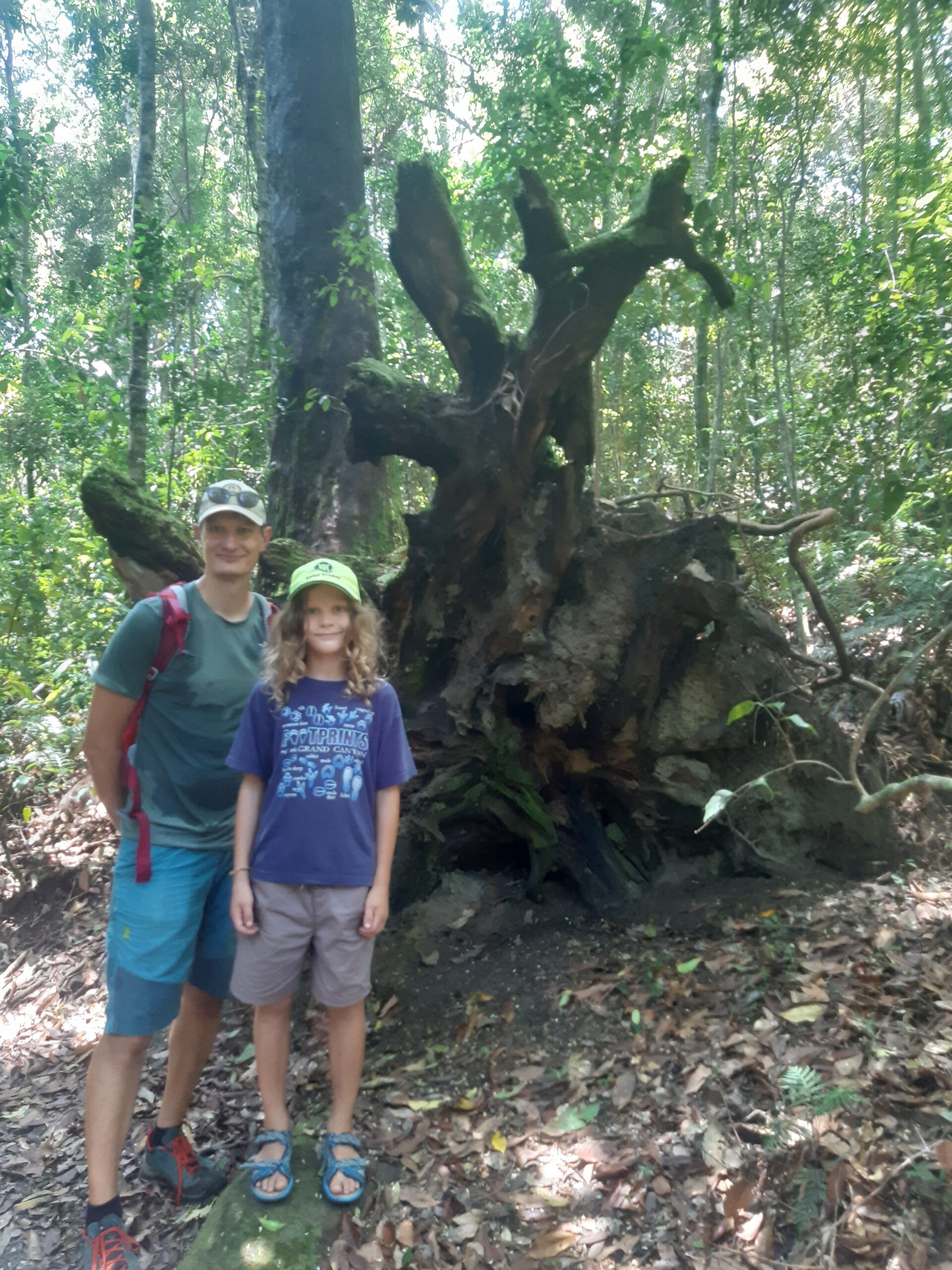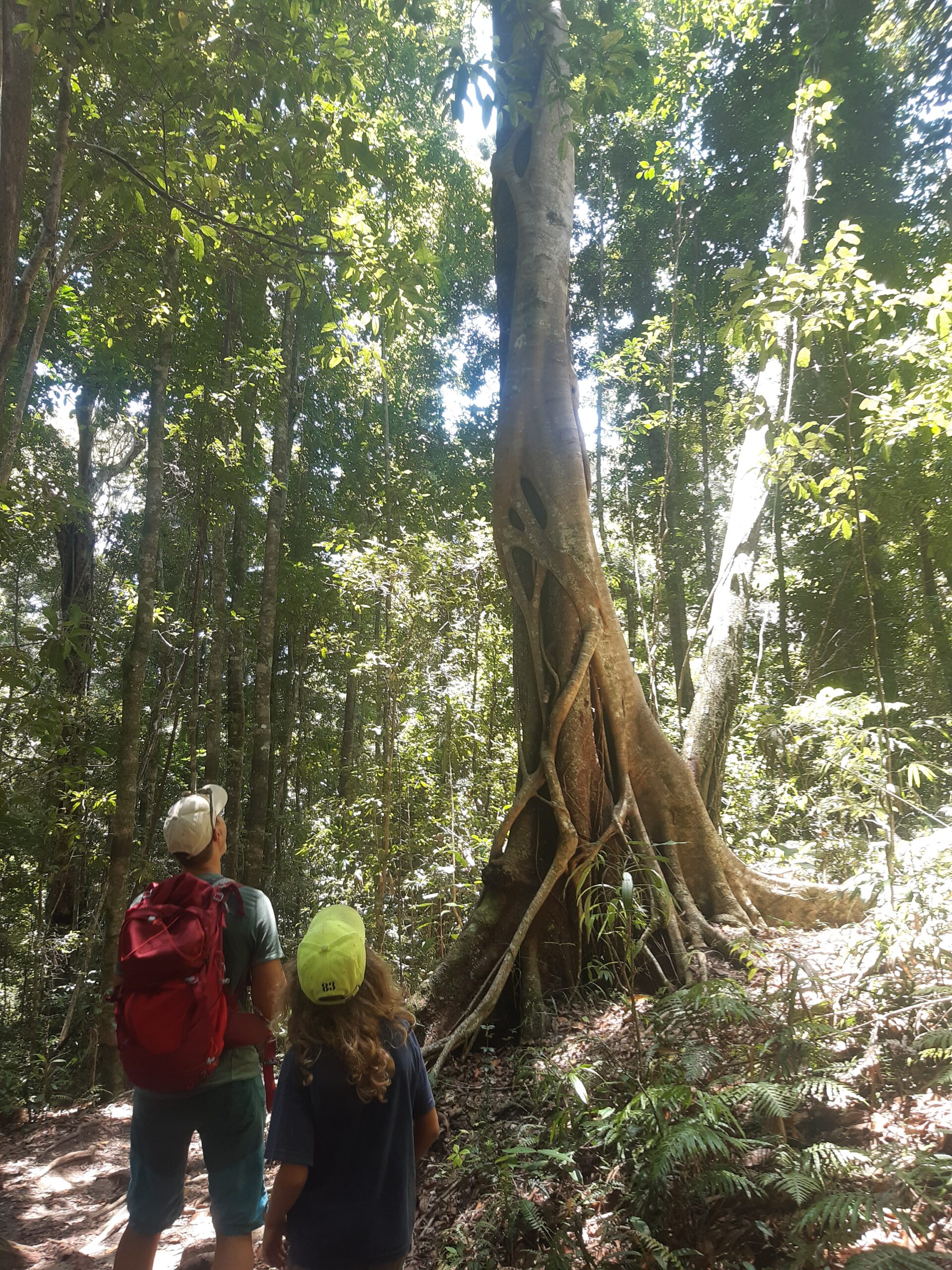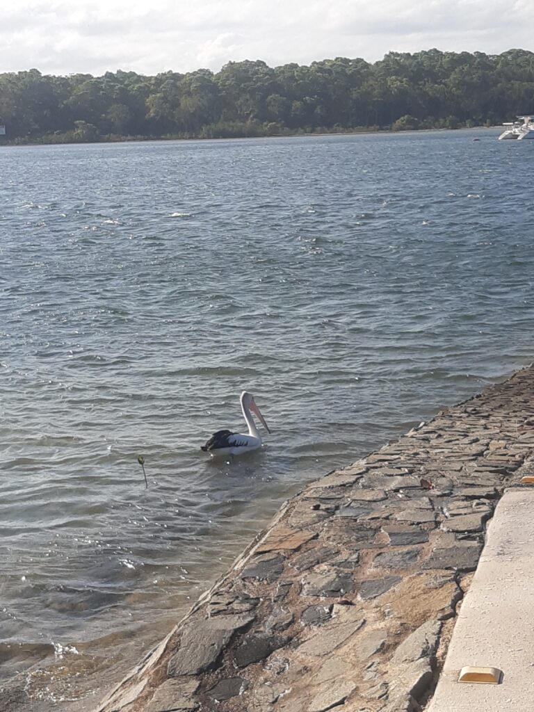 Après cette journée randonnée, on continue vers le nord après un arrêt dans un camping où l’on verra nos premiers kangourous en liberté ! Direction Tin Can Bay, petite ville abritant un spot de nourrissage de dauphins. On s’arrête pour la nuit (avec de l’electricité, enfin !) et au petit matin, nous voilà partis à pieds pour le centre. C’est une attraction animée par des bénévoles, qui nous expliquent qu’un groupe de dauphins vient régulièrement depuis une trentaine d’année, pas toujours les mêmes chaque jour. Ils les nourrissent de 2 à 3 kg de poissons par jour, tous les jours, ce qui représentent entre 10 et 20% des besoins des animaux : pour le reste, les dauphins doivent chasser. Cela permet d’avoir ce moment privilégié, sans pour autant domestiquer complètement les animaux. Les dauphins sont joueurs, notamment l’un d’entre eux qui aiment bien porter des objet sur son rostre (une branche aujourd’hui, mais on l’a déjà vu récupérer une bouteille ou bien des lunettes !). Maël leur donne deux morceaux de poissons, et reçoit en retour un « bisou de dauphin » : un souffle mouillé via l’évent. Une fois le nourrissage fini, tous les dauphins repartent : ils ont bien compris l’horaire et savent que quand il n’y en a plus, ce n’est pas la peine de rester.