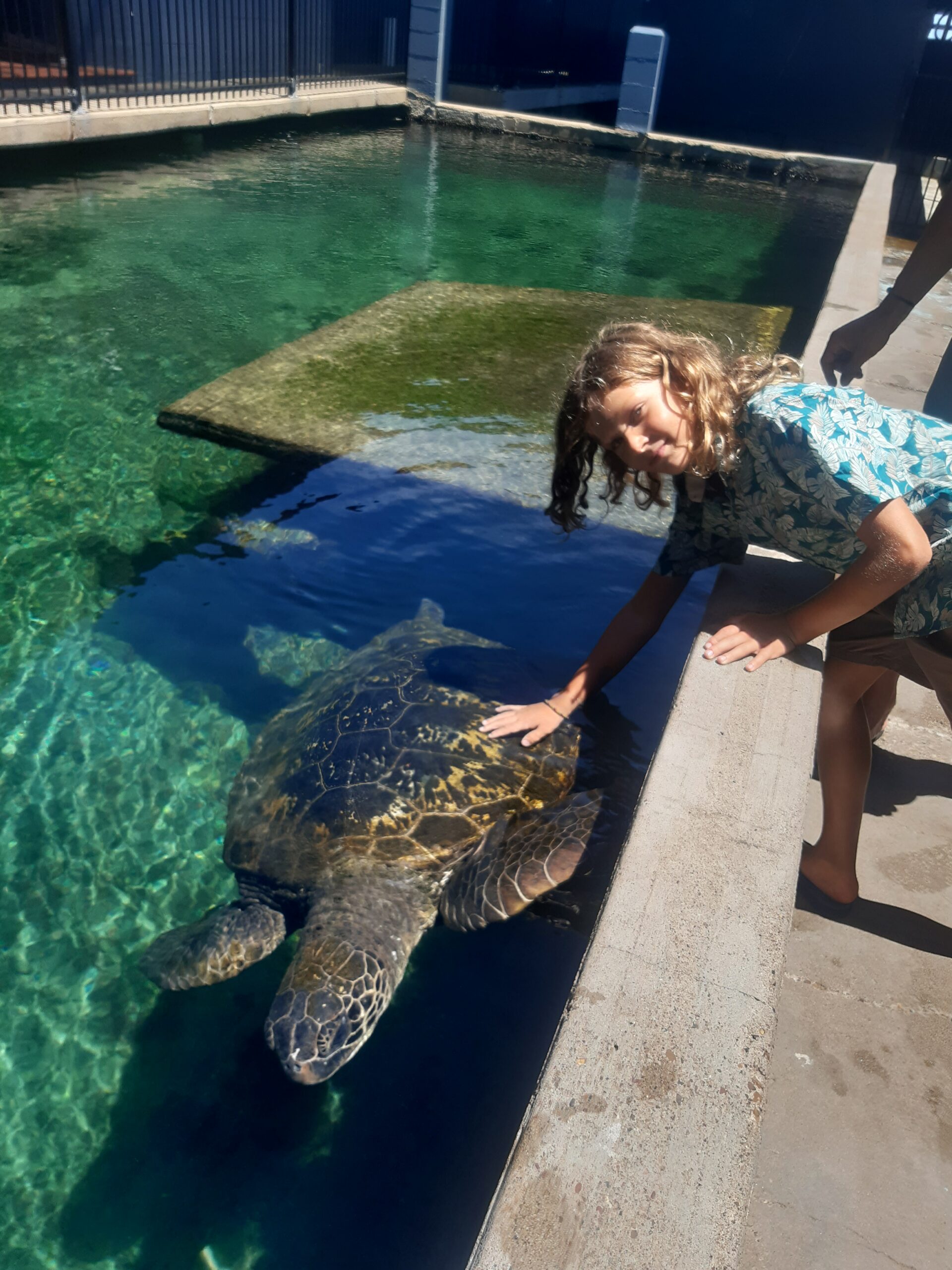 Le lendemain, on décidé d’aller visiter l’aquarium d’Hervey Bay, qui utilise de l’eau de mer filtrée pour recréer un environnement propice au développement de la vie coralienne. Il y a également 3 tortues, qui ont eu un accident au cours de leur vie et vivent depuis en captivité. On aura l’occasion de les caresser, joli combo avec les dauphins de la veille !