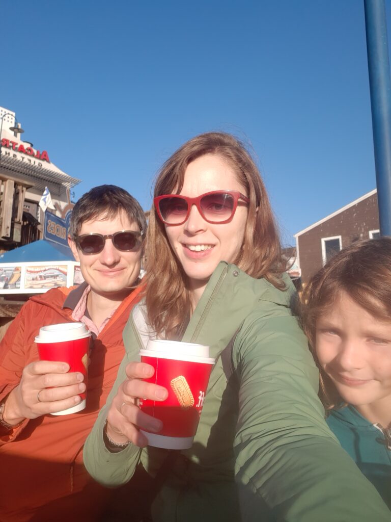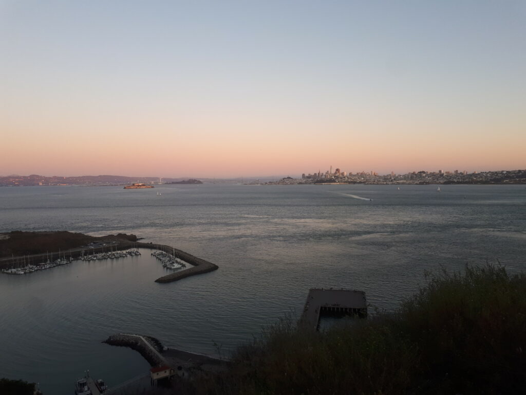 Samedi 11 octobre, direction San Francisco pour une journée en ville. Au programme pour commencer, la visite de l’île d’Alcatraz, que ni Guillaume ni Chloé n’avaient faite lors de leurs voyages respectifs dans l’ouest américain. Le ferry partant à 9h20, on choisit de se mettre en route vers 7h et de s’offrir un petit dej américain en arrivant : grands cafés et viennoiseries à emporter et déguster sur un quai. Guillaume demande un café taille M, oubliant qu’on est en Amérique, et se retrouve avec un format immense !